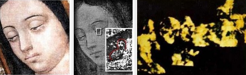 Fue mediante este procedimiento que se detectaron figuras diminutas, casi imperceptibles a simple vista. Las cuales, según la interpretación de los investigadores parecían reflejar personas y escenas presentes en el momento en que Juan Diego abrió su tilma.