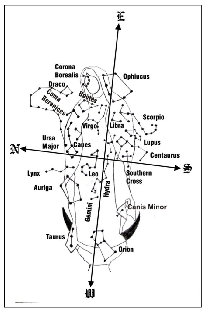 Sungenis observó que el mapa celeste representado en el manto aparece en forma de “espejo”, como si se contemplara desde fuera del cielo5. Además, identificó un total de 46 estrellas6 (22 a la derecha y 24 a la izquierda), organizadas con aparente precisión.