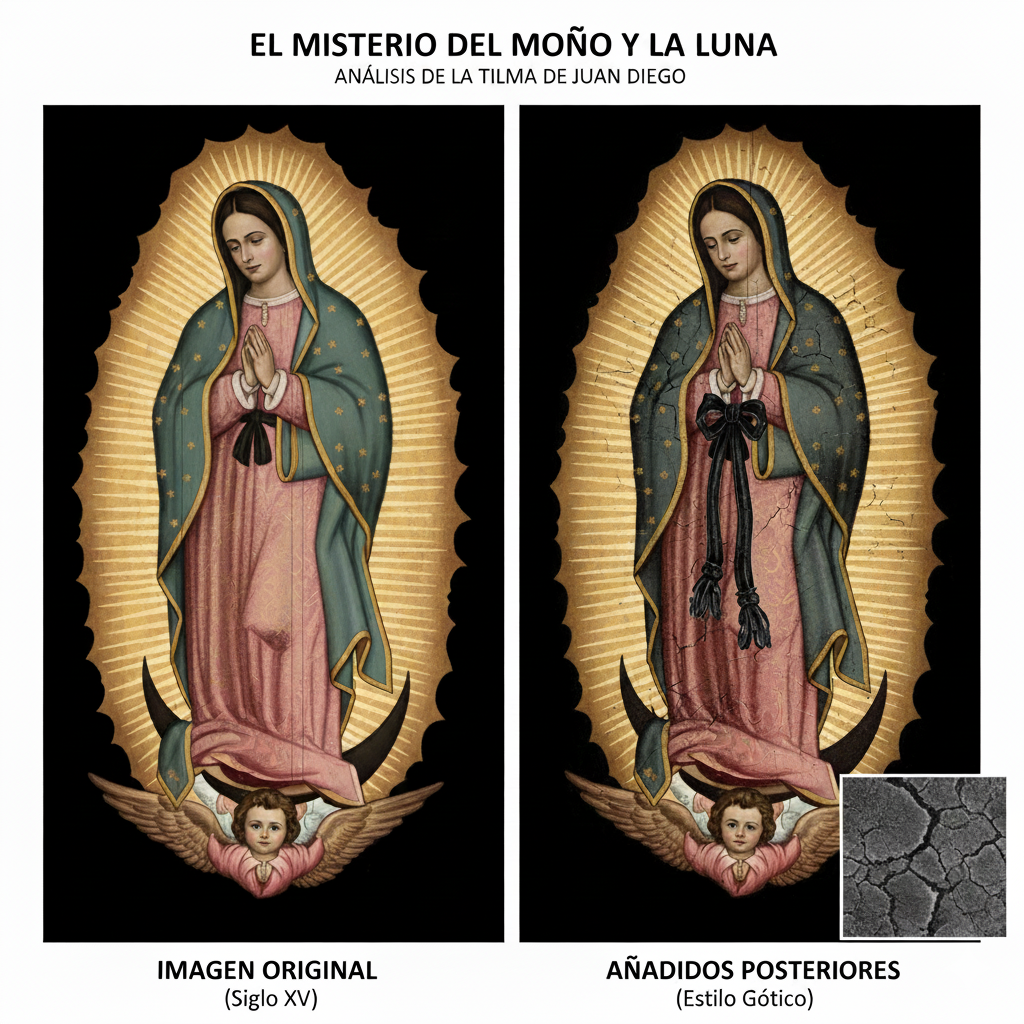 El moño y la luna de la Virgen de Guadalupe aparecen hoy como elementos inseparables de la imagen. Sin embargo, un análisis minucioso de la tilma de Juan Diego revela un dato inquietante: ninguno de los dos formaba parte del diseño original. Todo indica que fueron añadidos por mano humana, tiempo después de haberse plasmado la figura central.