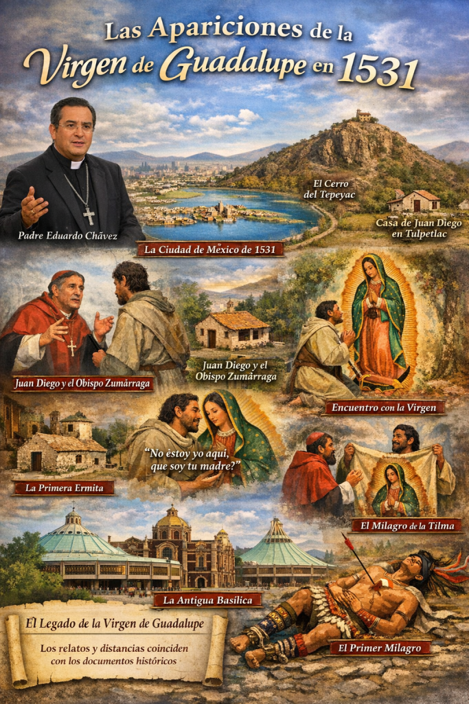 El video de una transmisión de vivo publicado en YouTube el 23 de octubre del 2025, presentado por el Padre Eduardo Chávez, se centra en explicar, de manera clara y detallada, tanto el recorrido físico como el sentido espiritual de Juan Diego durante las apariciones de la Virgen de Guadalupe en el año 1531.