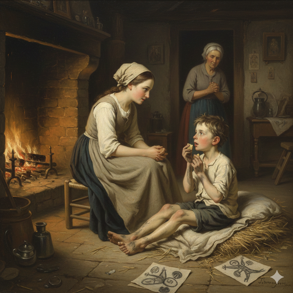 El 9 de marzo de 1858, Joséphine Doucet pidió a Bernadette Soubirous que visitara a su hermano, quien desde Navidad se encontraba en un estado alarmante. Diagnosticado por los médicos como un caso de “neuralgia incurable”, Jean-Marie era incapaz de caminar, con convulsiones, espasmos y la boca permanentemente abierta. Su aspecto causaba profunda impresión: postrado junto a la chimenea, rodeado de dibujos que él mismo realizaba, parecía haberse refugiado en un mundo interior marcado por el sufrimiento.